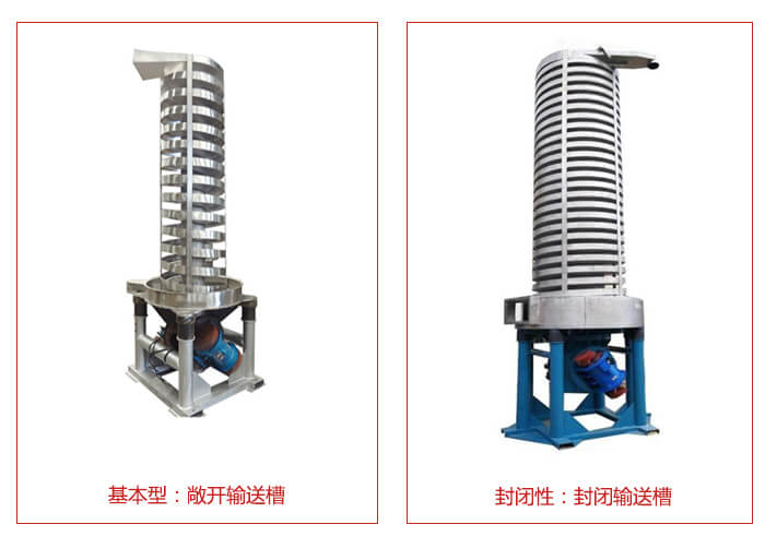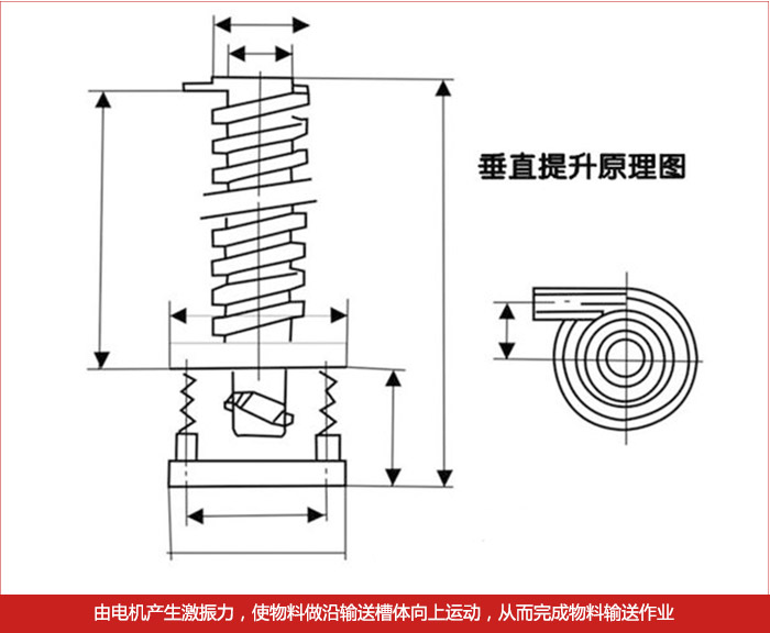 螺旋垂直振動(dòng)提升機DZC系列垂直振動(dòng)輸送機的驅動(dòng)裝置振動(dòng)電機安裝在輸送塔下部,兩臺振動(dòng)電機對稱(chēng)交叉安裝,輸送塔由管體和焊接在管體周?chē)穆菪斔筒劢M成,輸送塔座于減振裝置上,減振裝置由底座和隔振彈簧組成。當垂直輸送機工作時(shí),根據雙振動(dòng)電機自同步原理,由振動(dòng)電機產(chǎn)生激振力,強迫整個(gè)輸送塔體作水平圓運動(dòng)和向上垂直運動(dòng)的空間復合振動(dòng),螺旋槽內的物料則受輸送槽的作用,作勻速拋擲圓運動(dòng),沿輸送槽體向上運動(dòng),從而完成物料的向上(或向下)輸送作業(yè)。